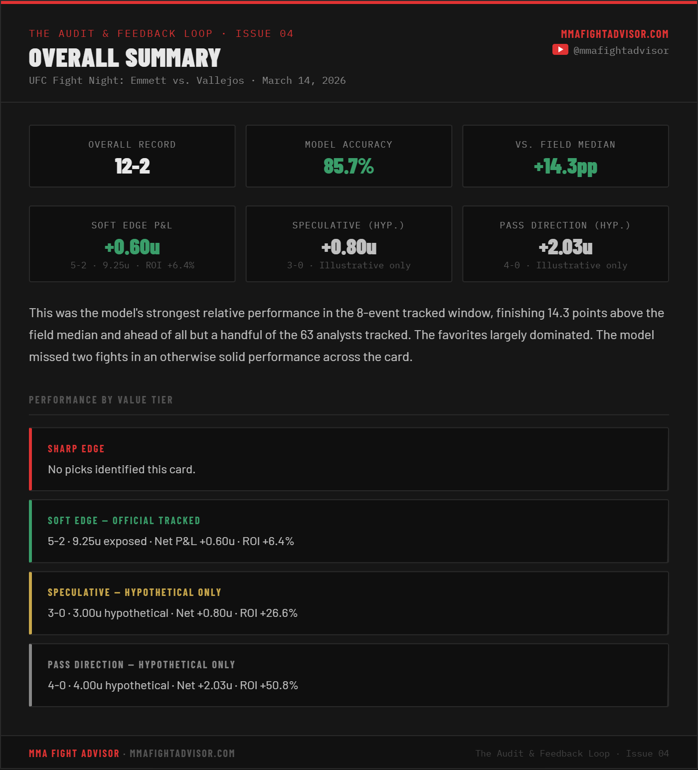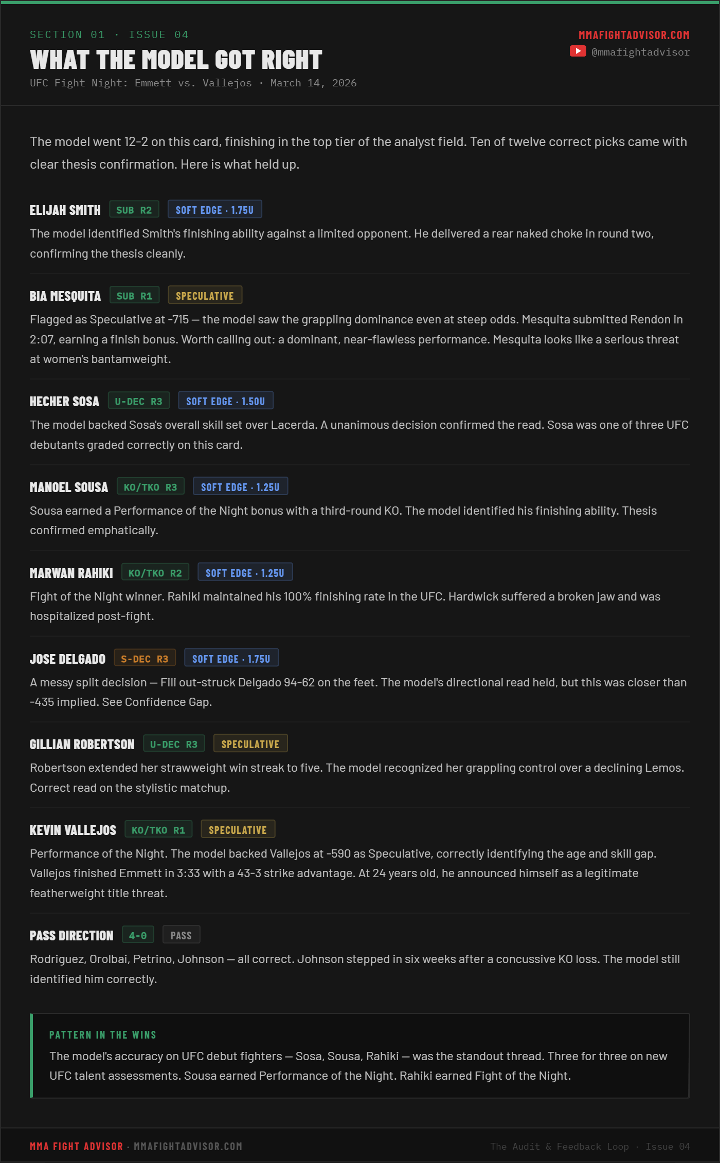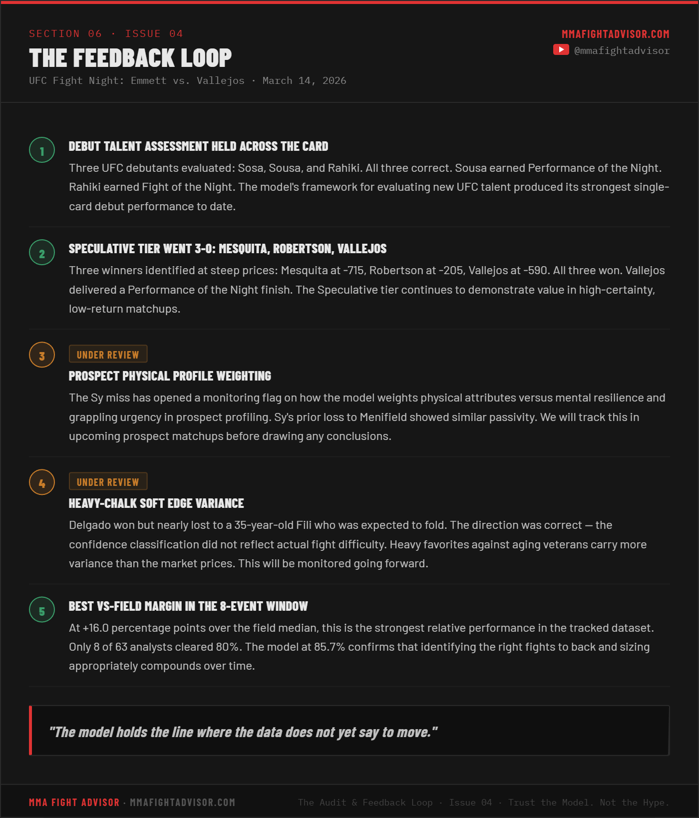 THE AUDIT & FEEDBACK LOOP · ISSUE 04 — UFC Fight Night: Emmett vs. Vallejos: The Card That DeliveredThe model went 12-2, outpaced 90% of the analyst field, and banked positive ROI. Here is the full breakdown.David Mitchell and Preston BotterMar 18, 2026ShareLeave a commentShareSubscribePrevious