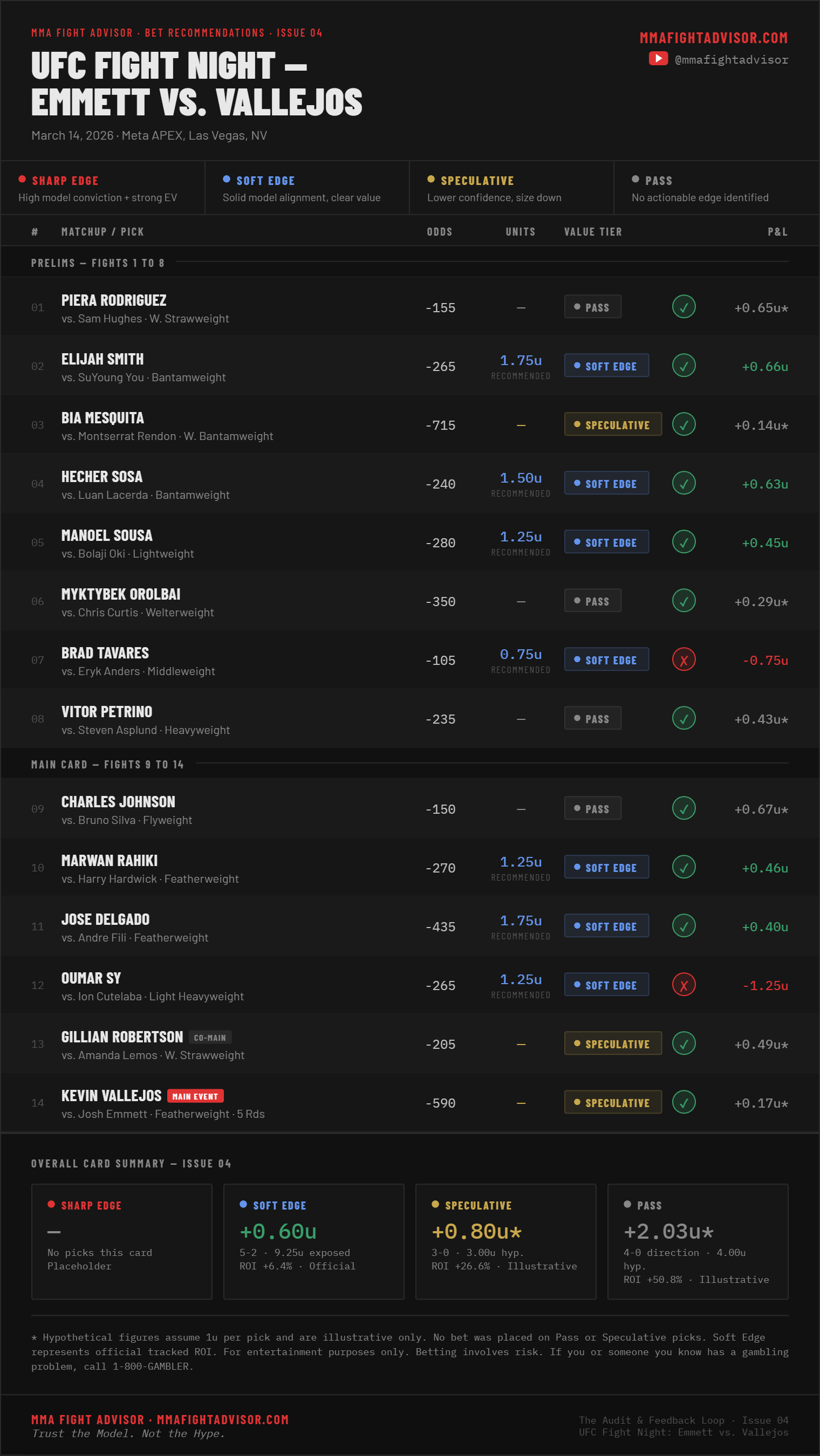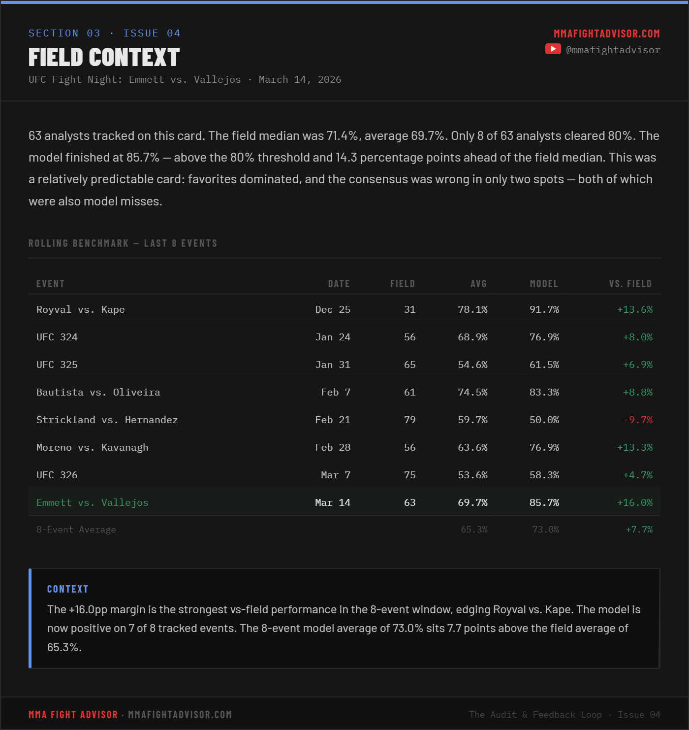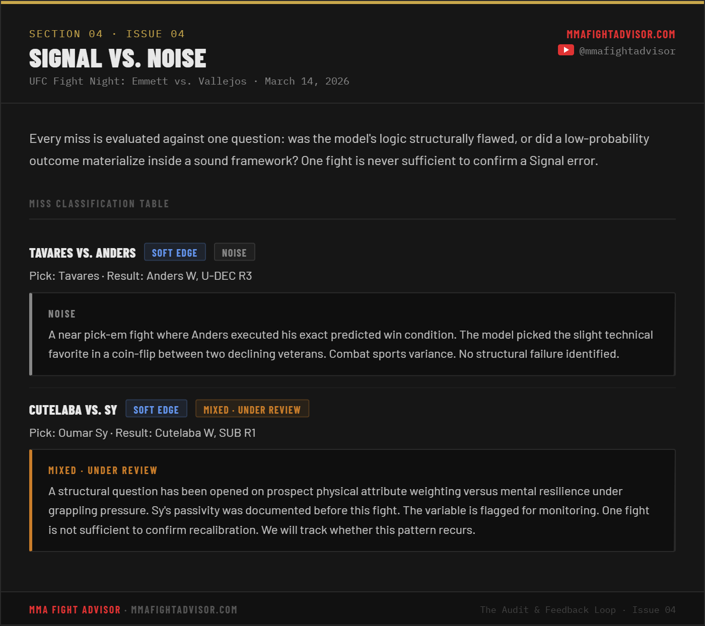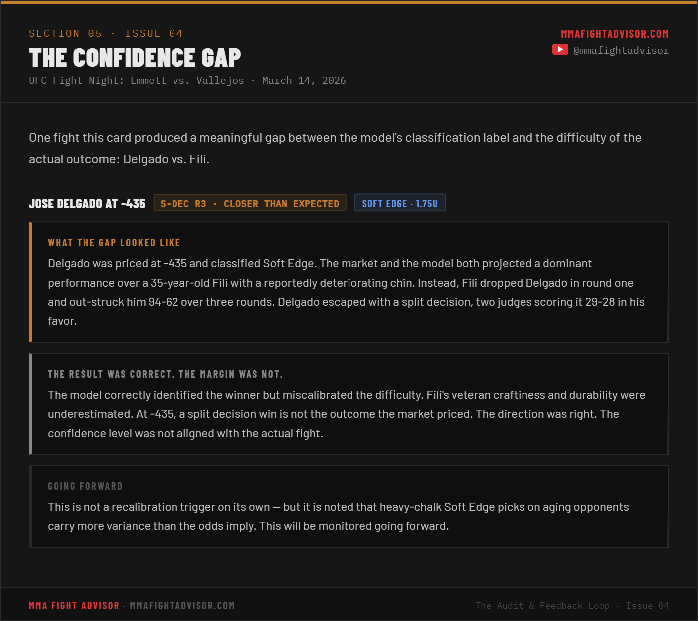 THE AUDIT & FEEDBACK LOOP · ISSUE 04 — UFC Fight Night: Emmett vs. Vallejos: The Card That DeliveredThe model went 12-2, outpaced 90% of the analyst field, and banked positive ROI. Here is the full breakdown.David Mitchell and Preston BotterMar 18, 2026ShareLeave a commentShareSubscribePrevious