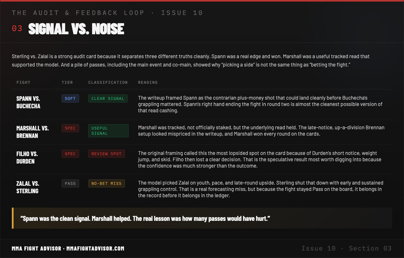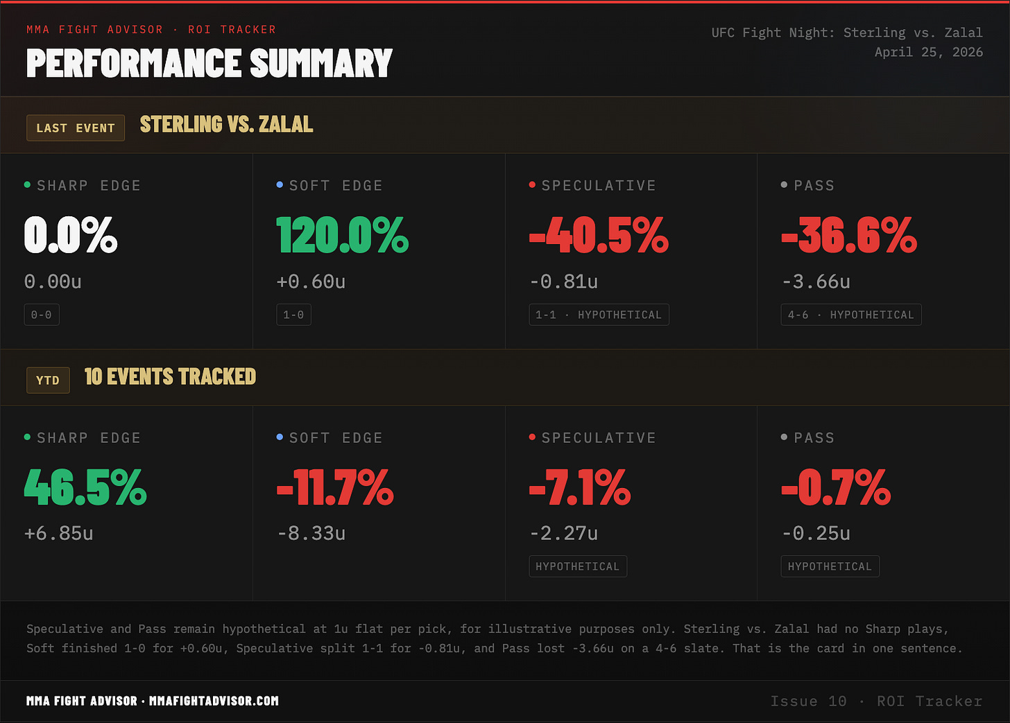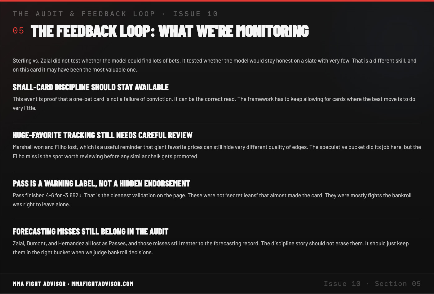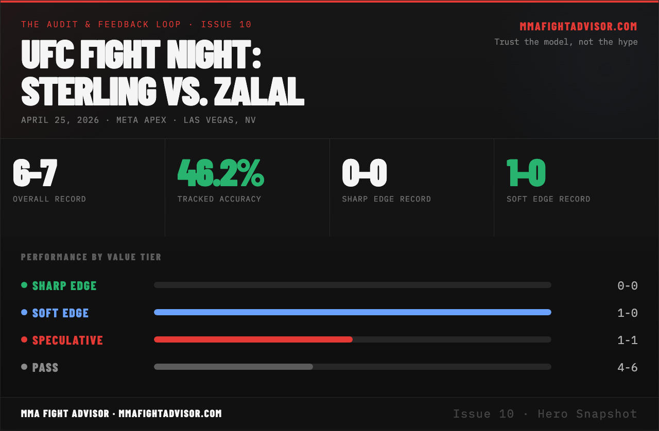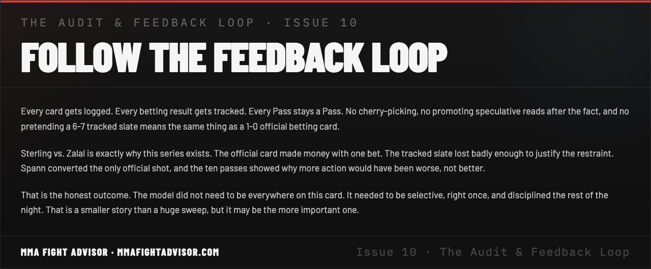 THE AUDIT & FEEDBACK LOOP · ISSUE 10 | UFC Fight Night: Sterling vs. Zalal | When One Bet Was EnoughPreston BotterApr 29, 2026ShareLeave a commentShareThanks for reading MMA Fight Advisor! Subscribe for free to receive new posts and support my work.SubscribePrevious