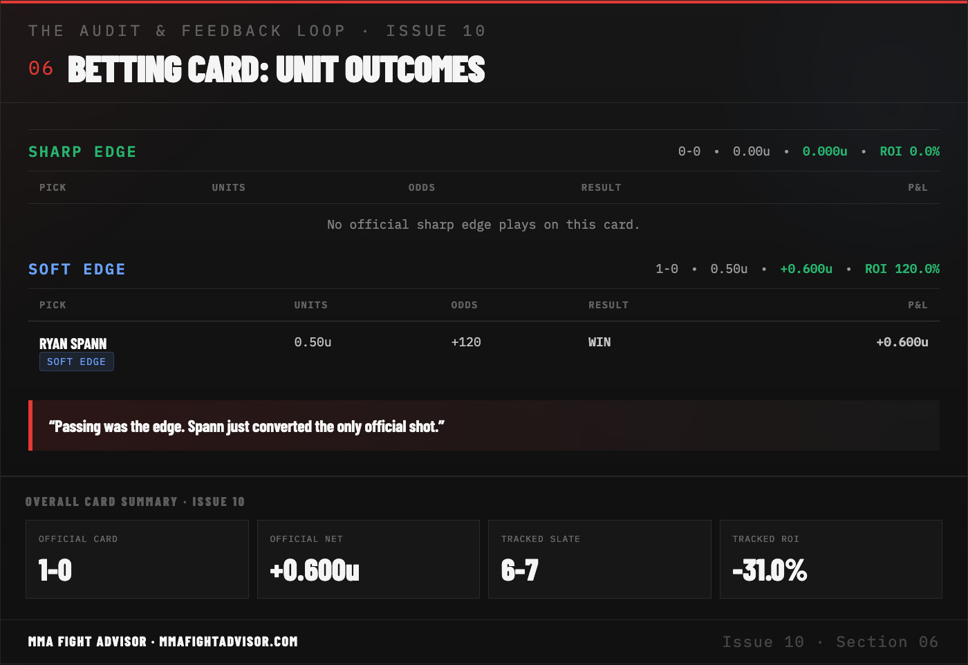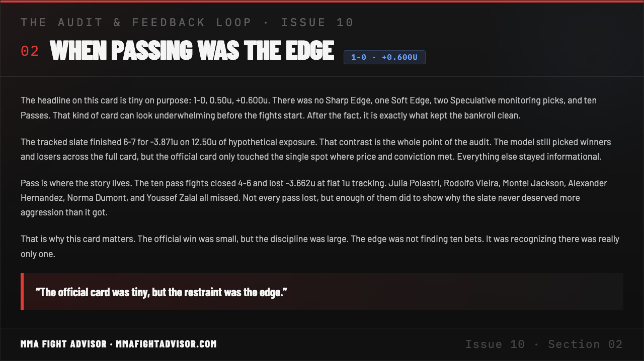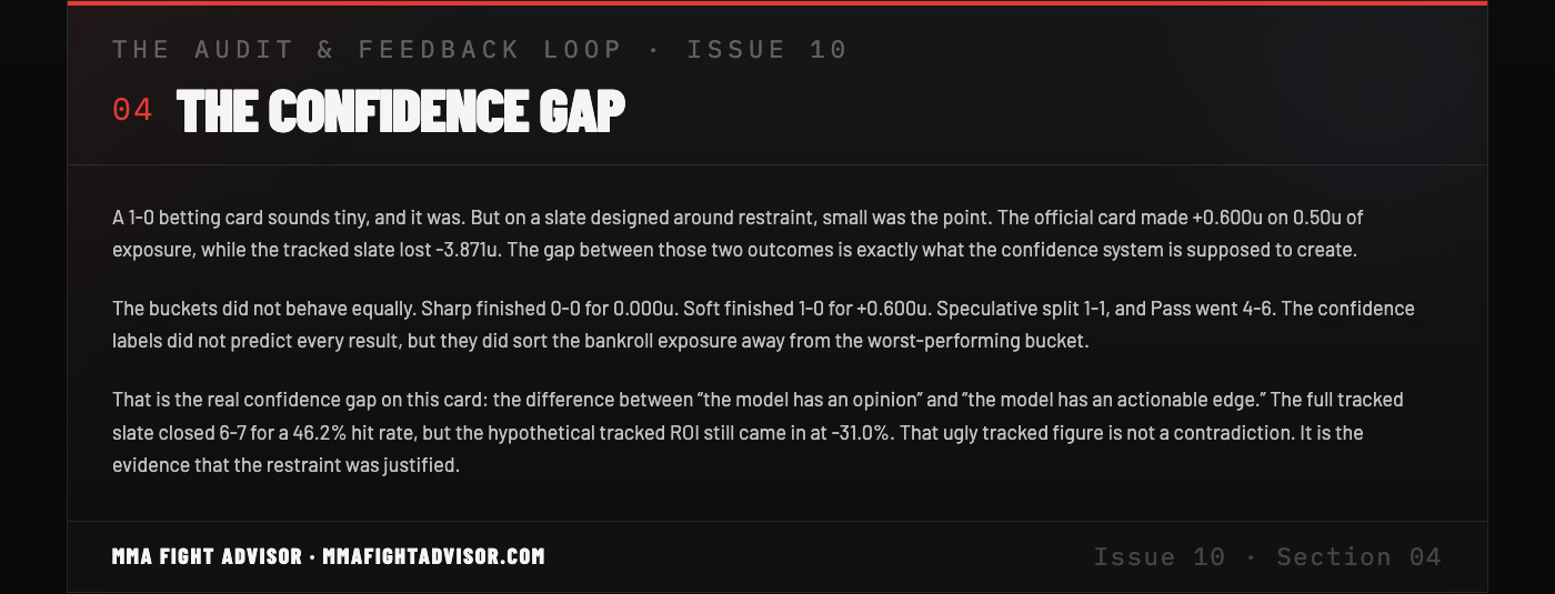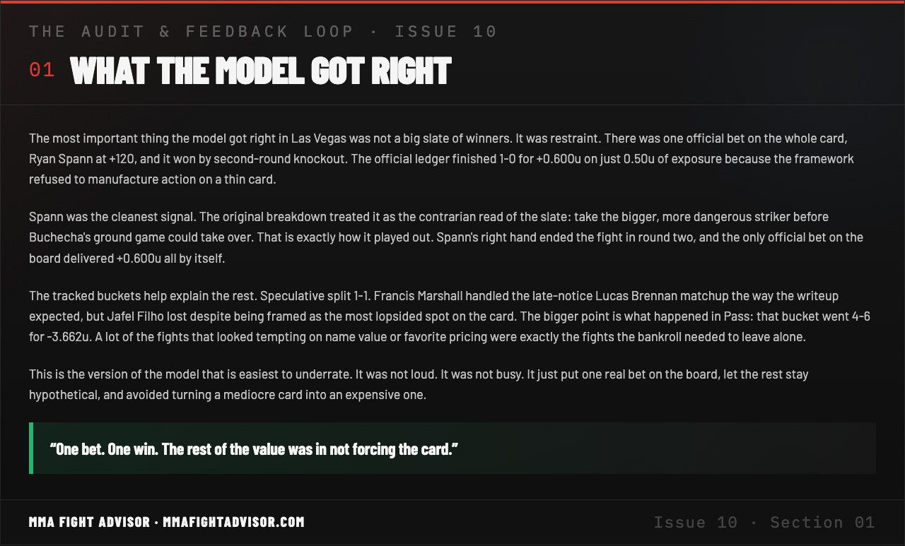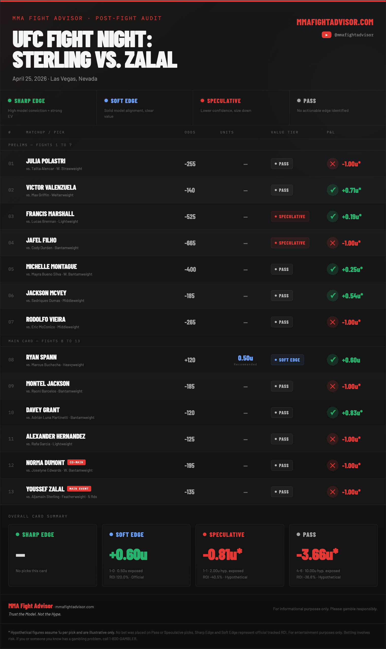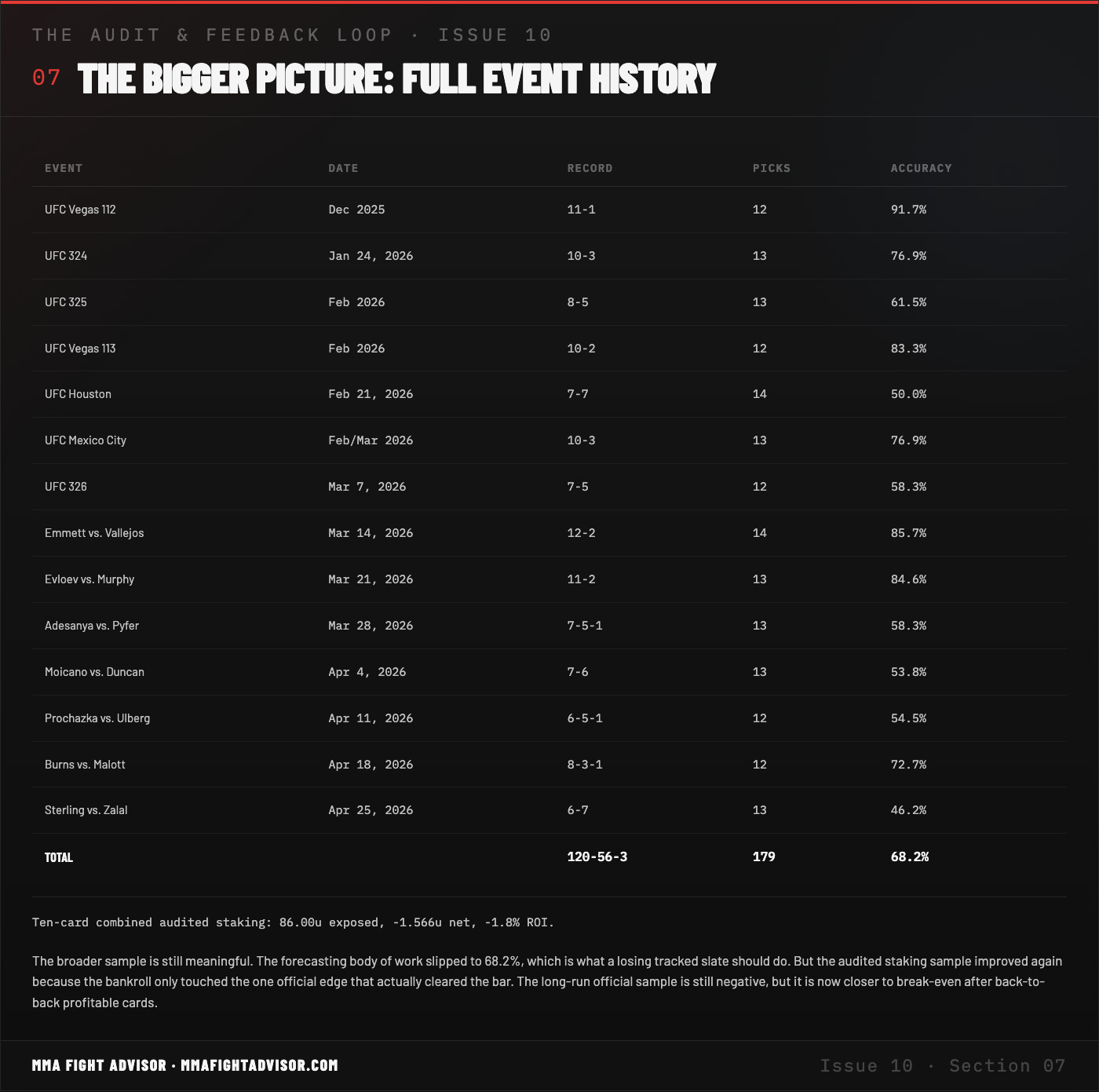 THE AUDIT & FEEDBACK LOOP · ISSUE 10 | UFC Fight Night: Sterling vs. Zalal | When One Bet Was EnoughPreston BotterApr 29, 2026ShareLeave a commentShareThanks for reading MMA Fight Advisor! Subscribe for free to receive new posts and support my work.SubscribePrevious