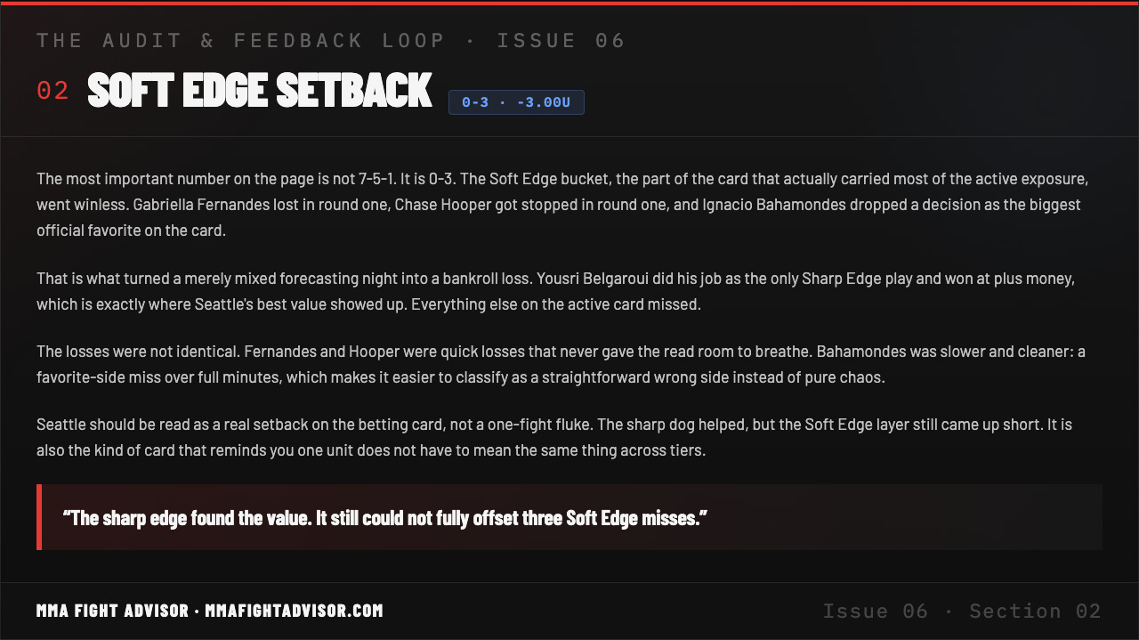 The card went 7-5-1 overall, but the official betting slate finished 1-3. Here’s where the model still held up, where the active exposure missed, and what Seattle adds to the feedback loop.