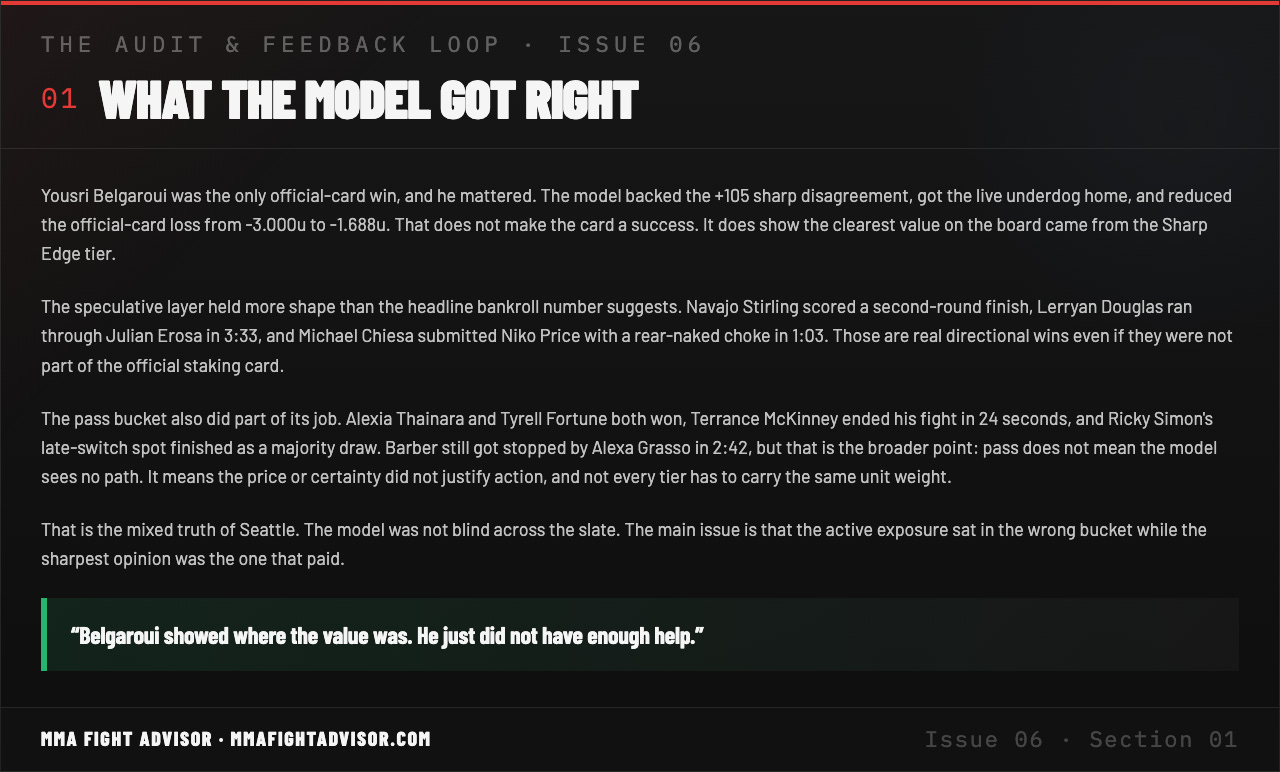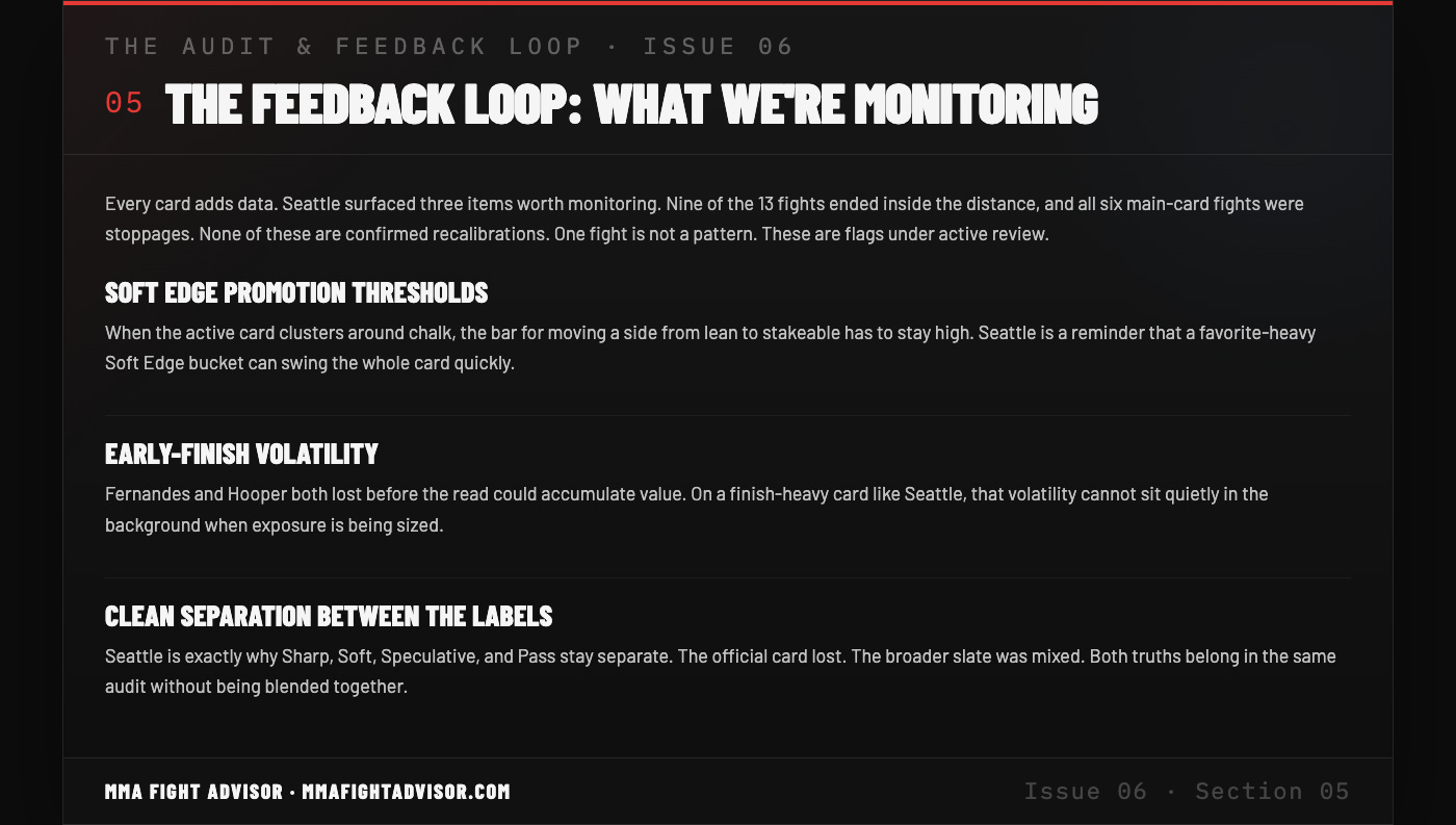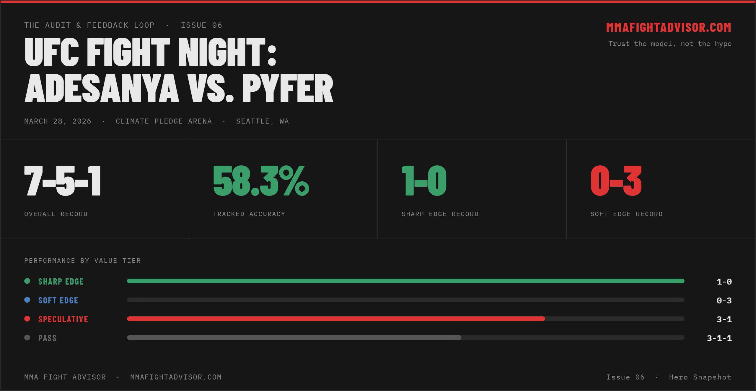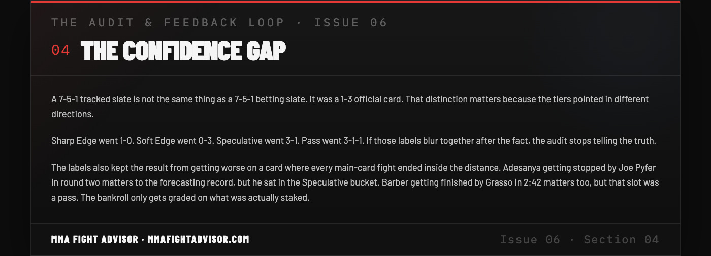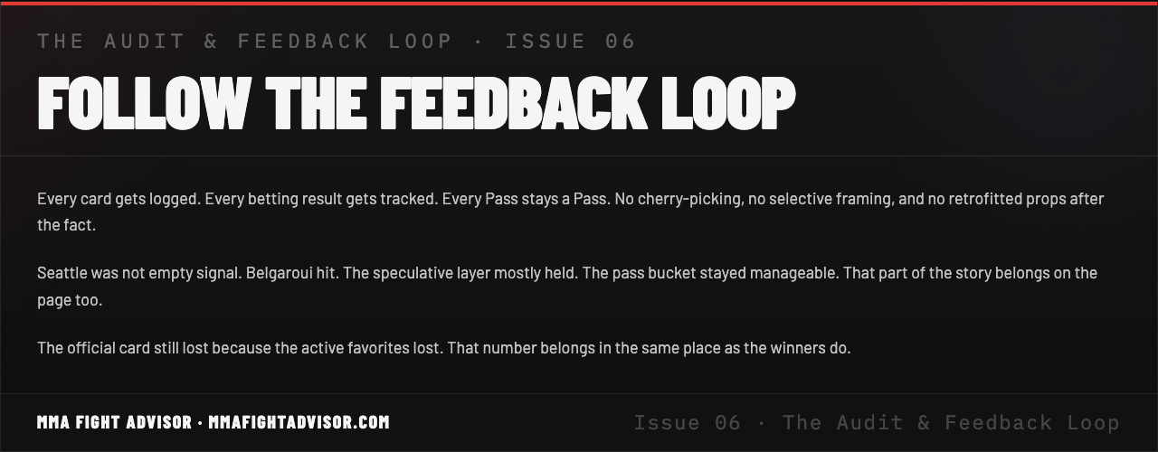 Title: THE AUDIT & FEEDBACK LOOP · ISSUE 06 — UFC Fight Night: Adesanya vs. Pyfer — One Sharp Win, A Losing Card