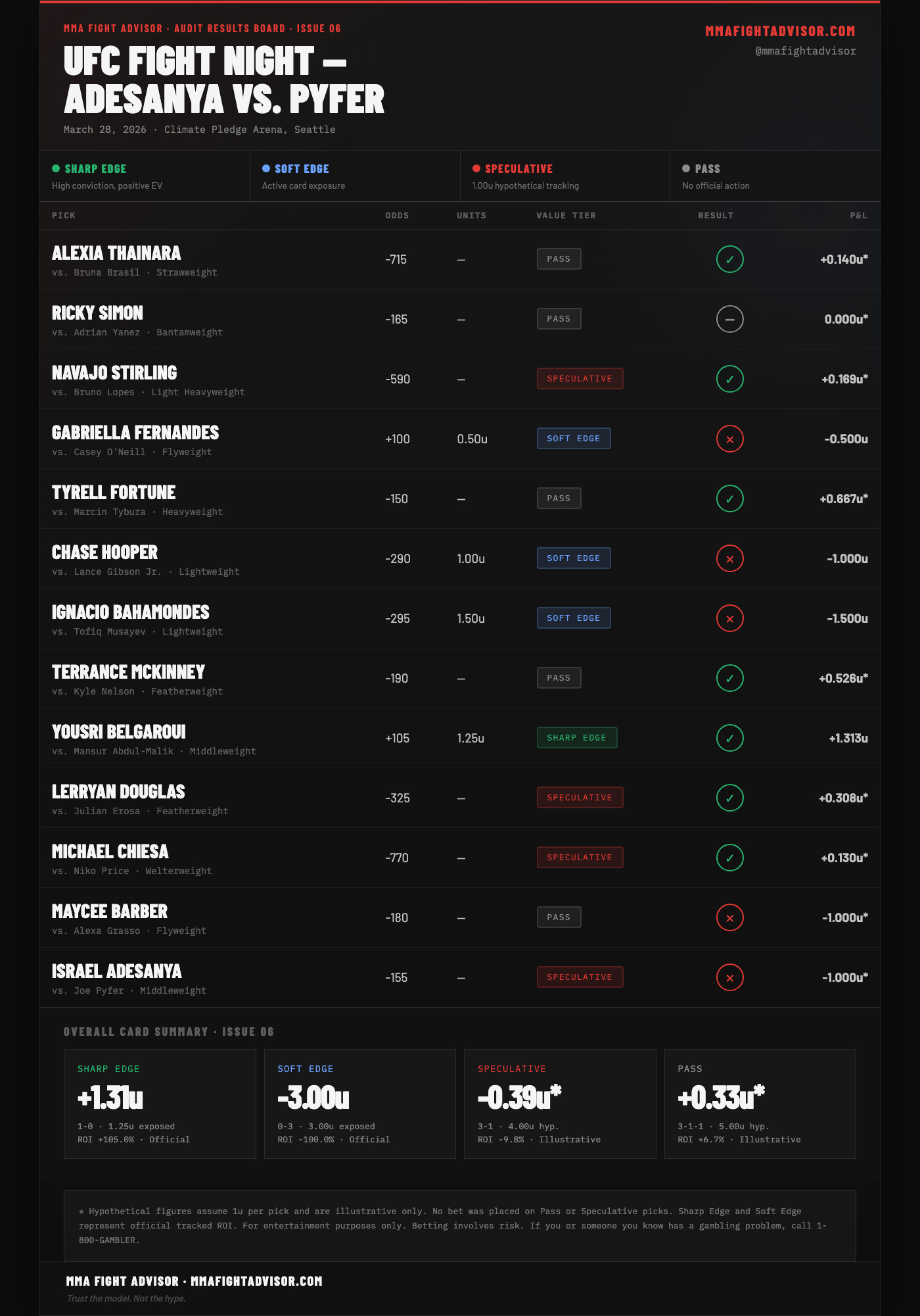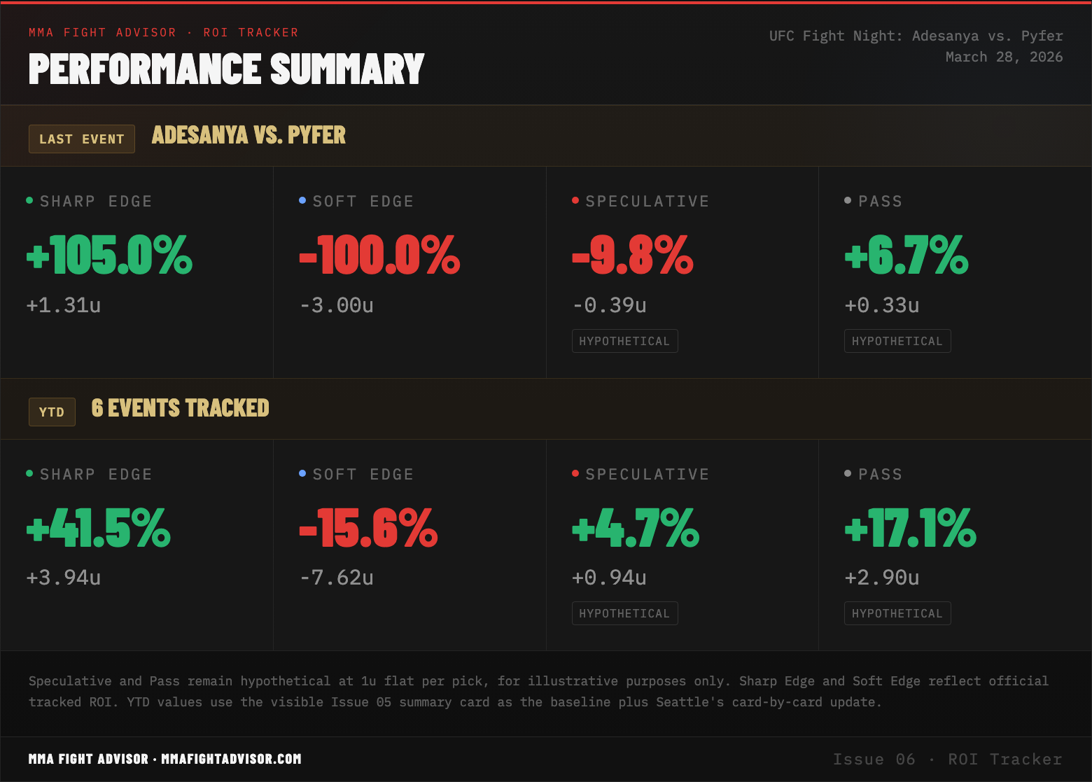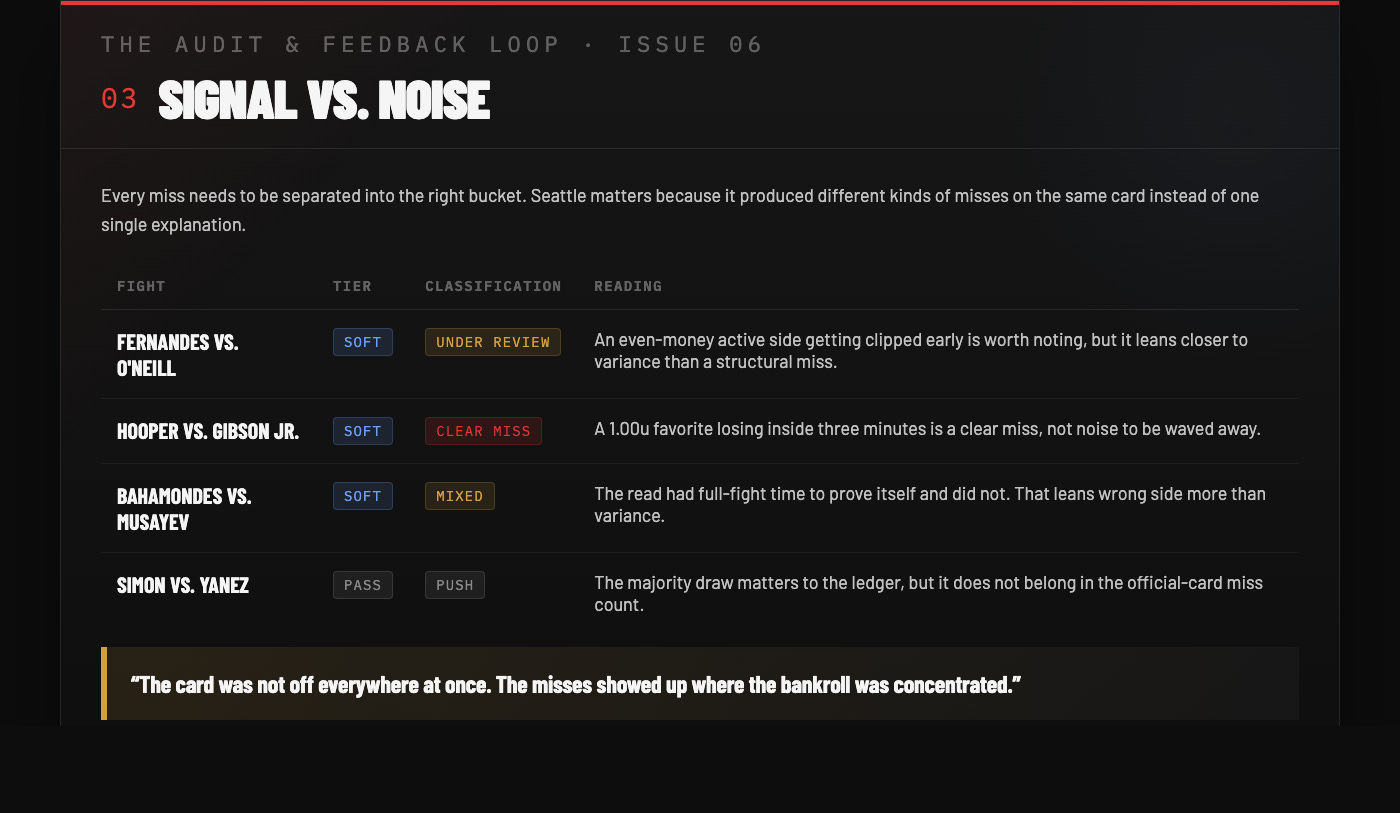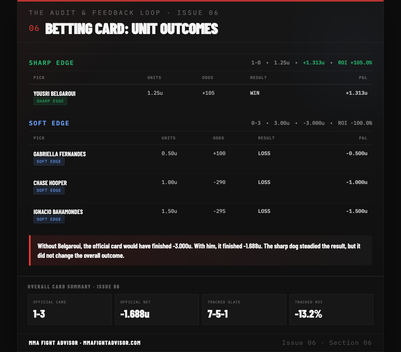 Title: THE AUDIT & FEEDBACK LOOP · ISSUE 06 — UFC Fight Night: Adesanya vs. Pyfer — One Sharp Win, A Losing Card
