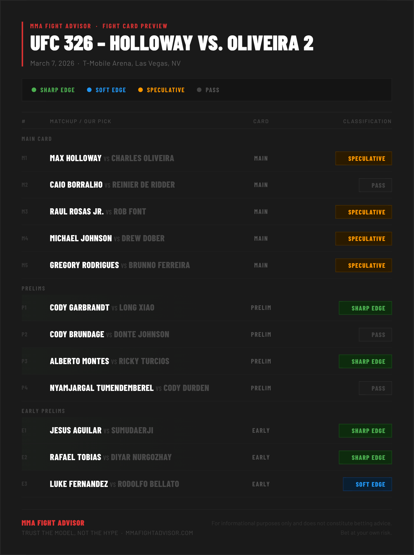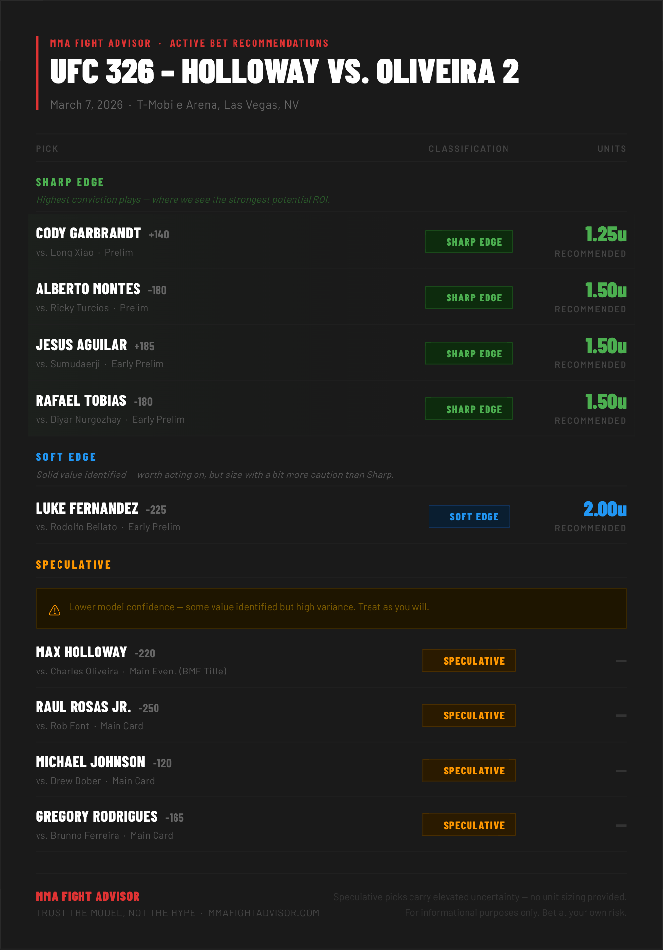 Below is our full model output for UFC 326: Holloway vs. Oliveira 2 from T-Mobile Arena in Las Vegas. Each fight is classified by edge tier, with unit sizing provided for Sharp and Soft Edge plays only. Speculative plays are listed for transparency — the model sees some value but confidence is lower and variance is higher. No unit sizing is provided for these.