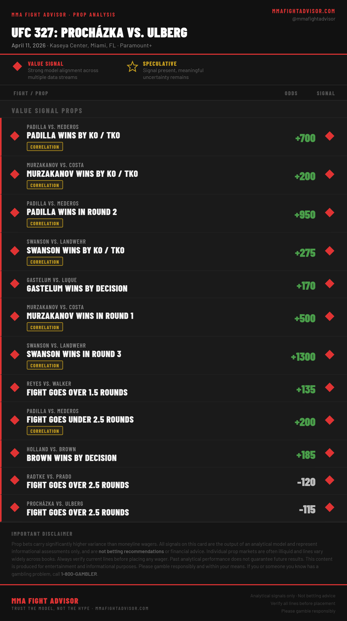Every prop on this card cleared the Value Signal threshold. What you do with that information, and how much you risk, is entirely your decision. A few things worth keeping in mind. Correlated props flagged on this card share outcome dependencies, meaning the Padilla cluster and the Murzakanov cluster are not independent signals. Playing multiple legs from the same fight compounds both upside and exposure simultaneously. On the longer-odds props, the +1300 and +950 lines carry real analytical value in the model, but the raw probability of hitting is low by definition. If those are of interest, conservative sizing makes more sense than treating them the same as a -120 line. The variance profile is meaningfully different even when the edge is real.
