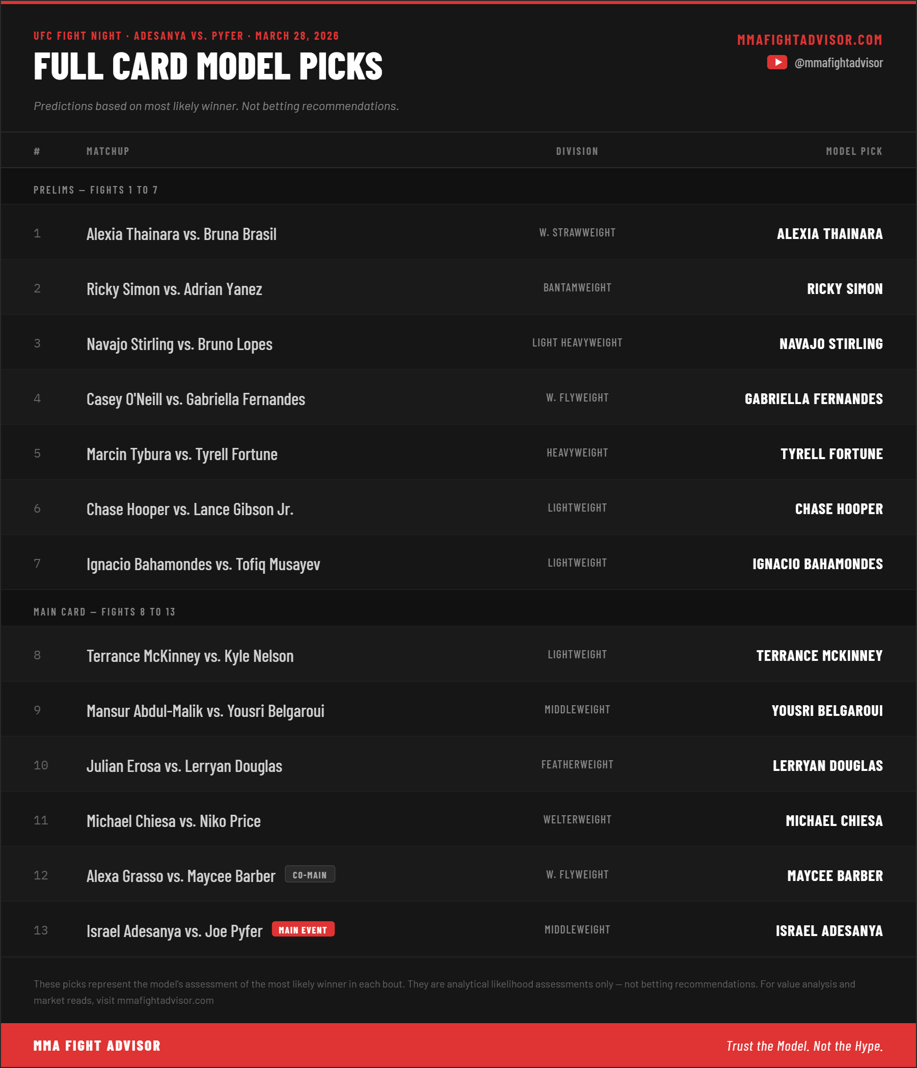 This is not a lock. The Emp model sits barely above a coin flip on this fight, reflecting genuine analytical uncertainty. The rust concern is real and unquantifiable. The chin question is legitimate. But the pick is Adesanya, and the case for it is grounded in data rather than sentiment.