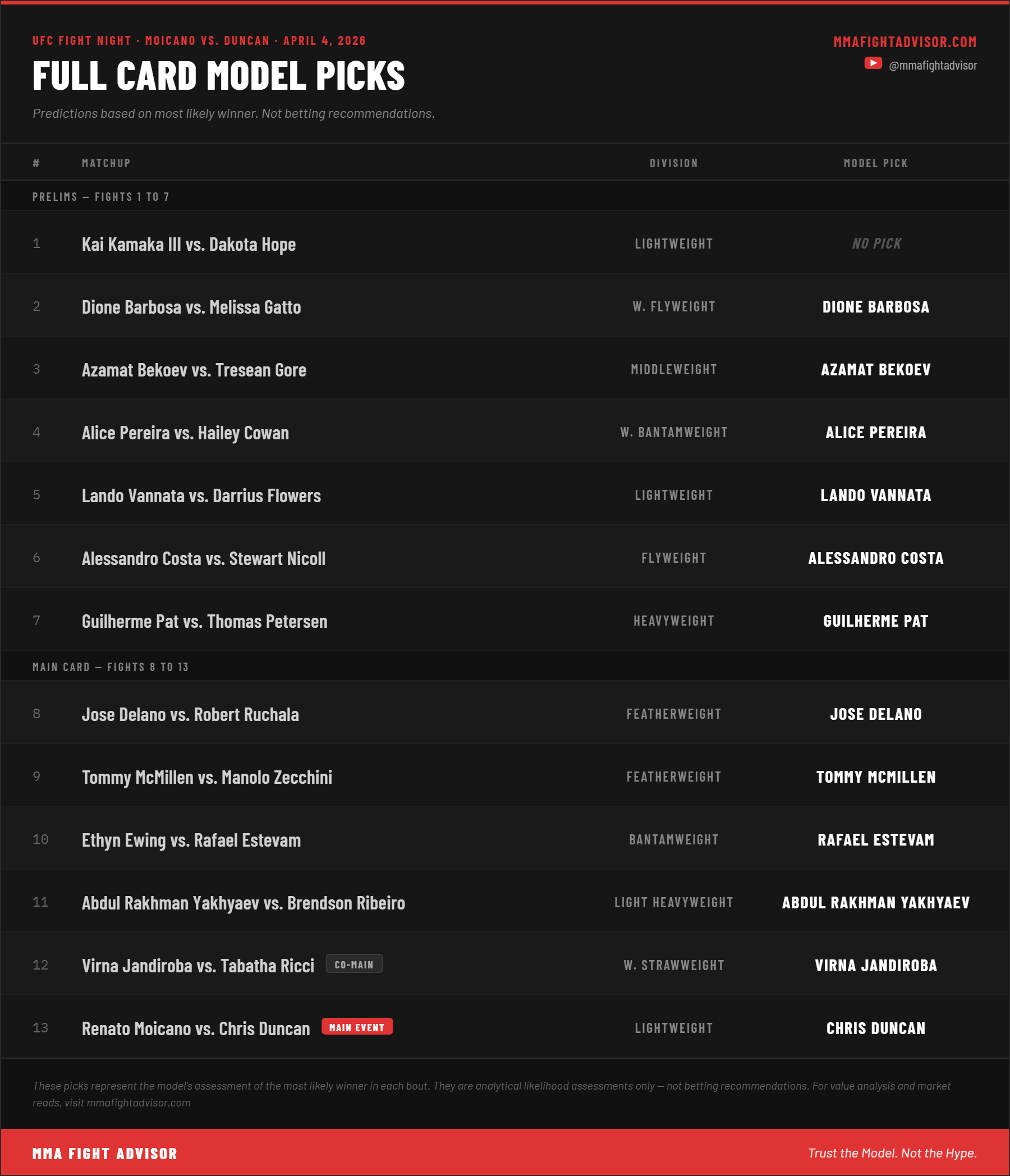 The model has weighed in on UFC Fight Night 272 and the headline call goes against the grain. Chris Duncan -- the four-fight finisher from Scotland -- gets the nod over Renato Moicano in Saturday’s main event, a pick that diverges sharply from the experience-and-grappling narrative dominating most pre-fight coverage. It is not the only story on a card loaded with prospects, debuting fighters, and a co-main event with genuine strawweight title implications, but it is the one that sets the tone for how the model reads this card.