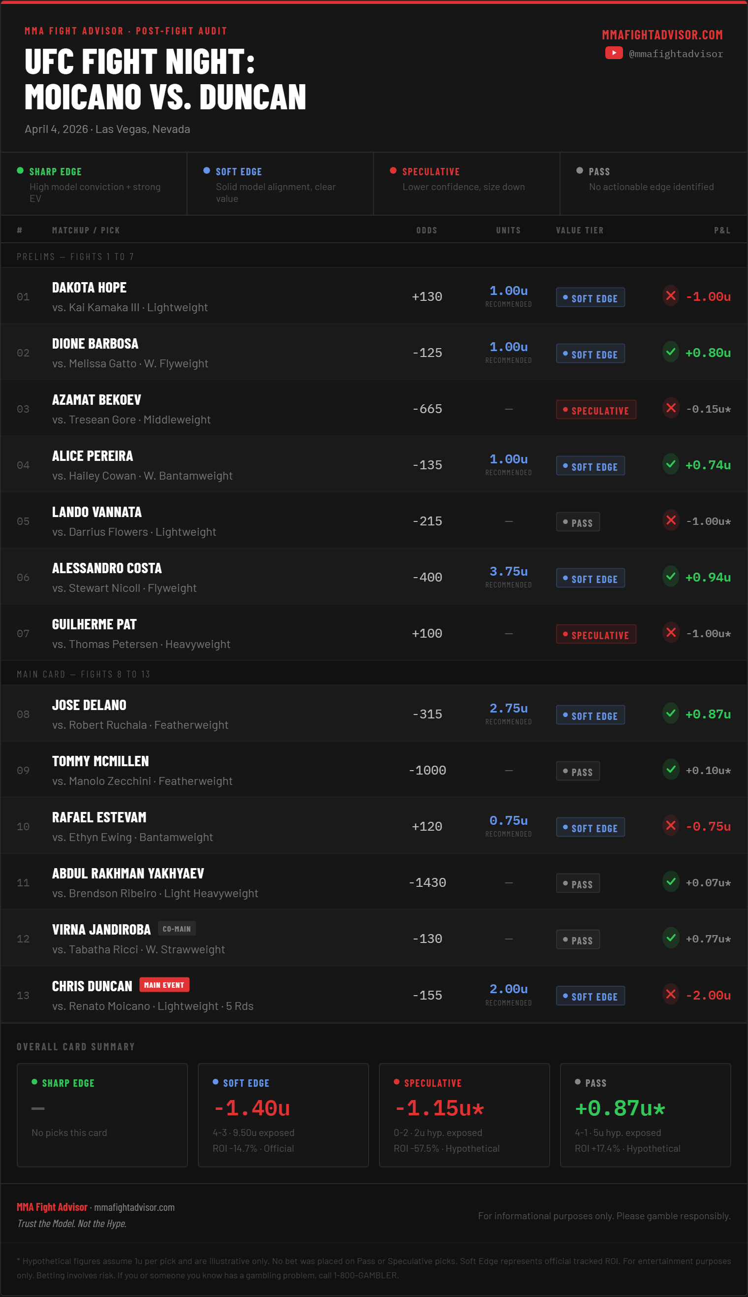 Soft Edge went 4-3 on the card. The Duncan main event loss at 2.00u was the damage — without it the card finishes solidly green. Costa and Delano both delivered. Full breakdown in the card below. The audit and feedback loop analysis will come in the next days to see what lessons from this can be taken.
