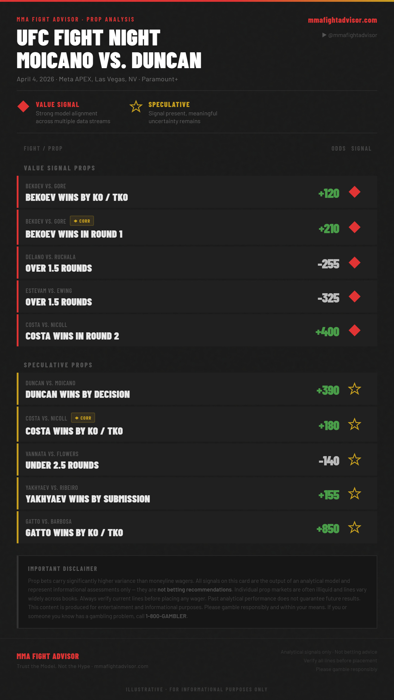 All prop signals in this report are speculative and experimental in nature. Prop bets carry significantly higher variance than moneyline wagers, and individual markets are often illiquid with lines varying widely across books. This content represents analytical signal output only and is not betting advice. Always verify current lines before placing any wager. Past analytical performance does not guarantee future results. Please gamble responsibly. If you or someone you know has a gambling problem, call 1-800-GAMBLER.