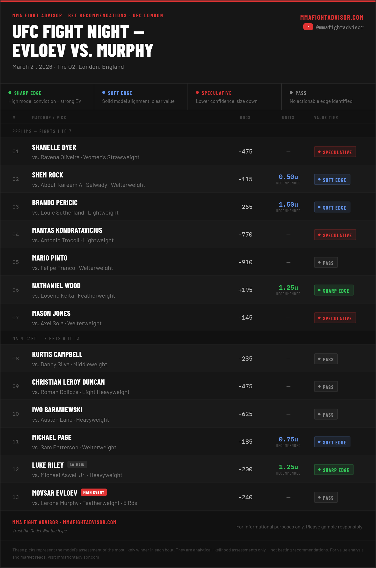 UFC London Bet Recommendations: Evloev vs. MurphyThe model's picks, value tiers, and unit sizing for all 13 fights — Trust the Model, Not the Hype.David MitchellMar 20, 2026ShareLeave a commentShareSubscribePrevious